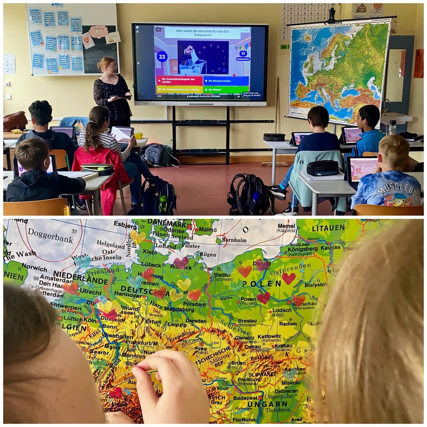 Zum Abschluss durfte jedes Kind noch ein Klebeherzchen vergeben für den Ort in Europa, mit dem besondere Erinnerungen, Emotionen und Erfahrungen verknüpft sind: Hier konnten wir einmal wieder nachvollziehen, wie wunderbar vielschichtig und aufgeweckt unsere Lernenden sind, die nämlich beim Kleben ihrer Herzen nicht müde wurden, viele interessante Geschichten zu Urlaubsländern, Traumreisezielen und auch Heimatländern zu erzählen.