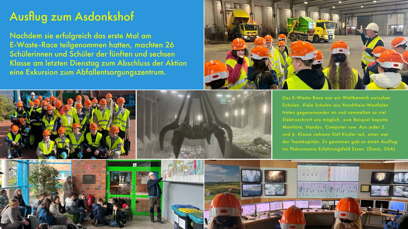 Das E-Waste-Race war ein Wettbewerb zwischen Schulen. Viele Schulen aus Nordrhein-Westfalen traten gegeneinander an und sammelten so viel Elektroschrott wie möglich, zum Beispiel kaputte Monitore, Handys, Computer usw. Aus jeder 5. und 6. Klasse nahmen fünf Kinder teil, einer war der Teamkapitän. Zu gewinnen gab es einen Ausflug ins Phänomania Erfahrungsfeld Essen. (Dana, 06A)