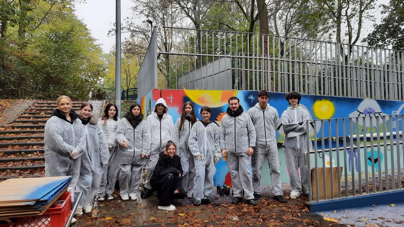 Am 29.Oktober 2024 trotzten die Schülerinnen und Schüler des Q2er Kunstkurses dem Nieselregen und gestalteten zusammen mit der Streetbox Moers (Caritas) und im Auftag der Stadt Moers die neue Rampe hinter dem Schulgelände zum Rheinkamper Ring hin. Die Rampe wurde neu von der Stadt angelegt und bisher mit weniger schönen Kunstwerken und Aussagen gestaltet. Um diesem Vandalismus ein Ende zu setzen, wurden alle Moerser Schulen gebeten Entwürfe für die Betonelemente zu entwerfen. So entwarfen die KünstlerInnen des GREM im Unterricht Konzepte, die tatsächlich allesamt realisiert wurden.