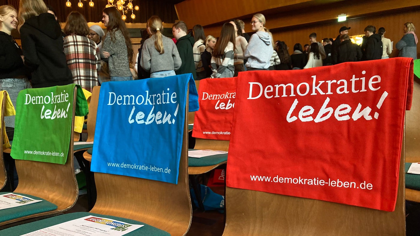 Am 28.November trafen sich über 200 Schüler:innen der weiterführenden Schulen aus Moers, um für Demokratie einzustehen, sich in Workshops auszutauschen, zu diskutieren und auf kreativen Wegen „Mut machen und Mit machen“ auszuprobieren.