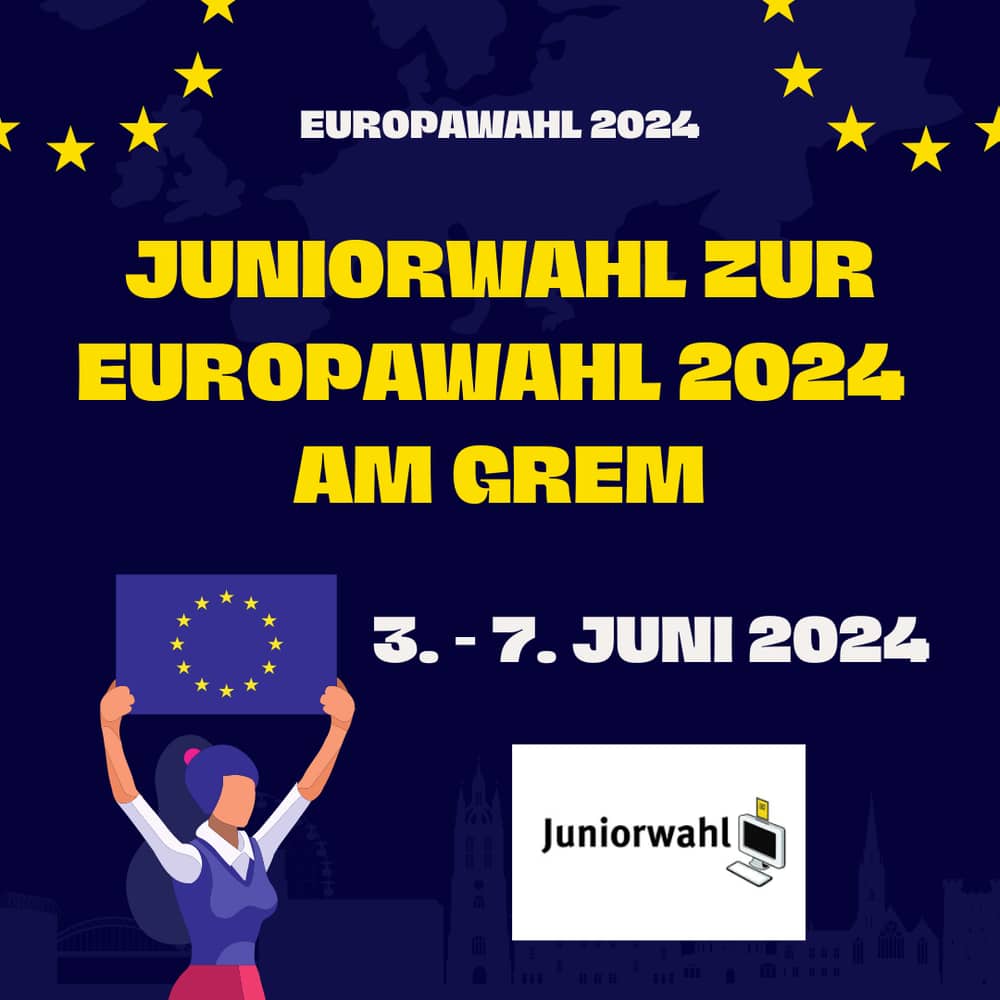 Als Abschluss unserer Projektreihe „Das GREM ist fit für die Europawahl" findet vom 3. bis 7. Juni bei uns die Juniorwahl 2024 statt. Schülerinnen und Schüler der Jahrgangsstufen 9 bis Q1 haben in der kommenden Woche die Möglichkeit, ihre Stimme abzugeben und so einen Einblick in den demokratischen Wahlprozess zu erhalten. Die Veranstaltung läuft parallel zur Europawahl und anschließend an unsere Abgeordneten-Gesprächsrunde und den Europawahl-Fokus des derzeitigen Politik- und sozialwissenschaftlichen Unterricht.