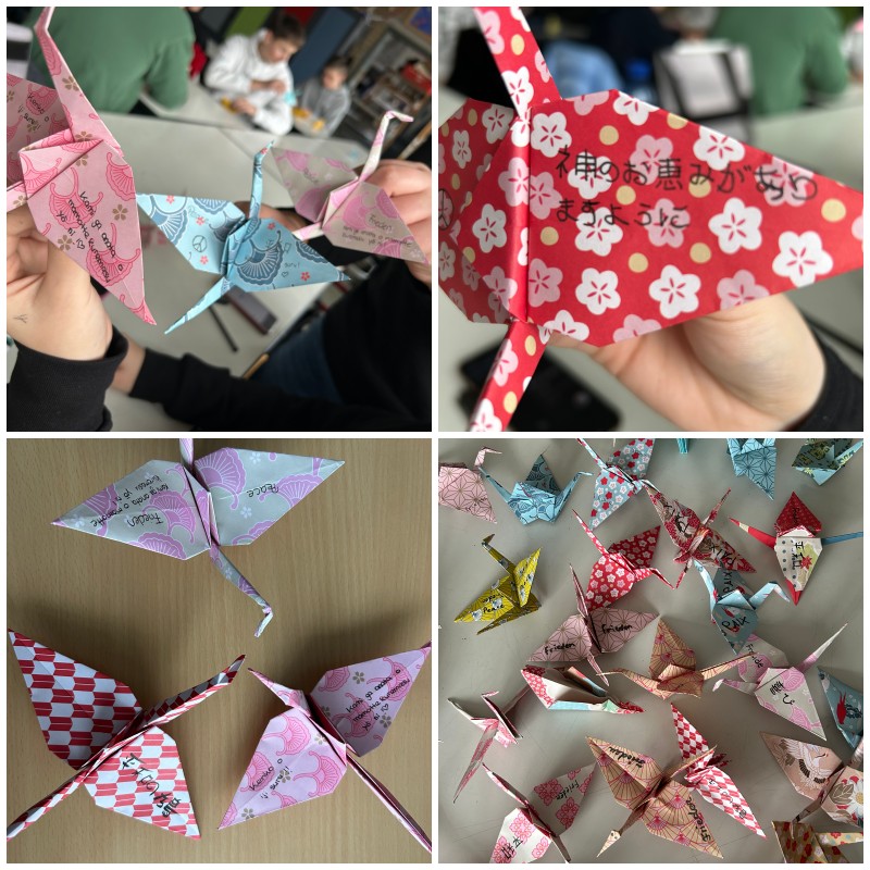 Als Zeichen für den Aufruf zu einem Leben in einer friedlichen Welt haben auch wir, die 10 B, Kraniche gebastelt, die zu unserem Partnerkreis nach Durham geschickt wurden. Dort findet vom 18.3.2024 bis 15.4.2024 eine Kunstinstallation am Prince Bishops Place mit den Kranichen aus aller Welt statt. Ein Teil dieser Kraniche wird anschließend nach Hiroshima geschickt und dort am Denkmal von Sadako niedergelegt.
