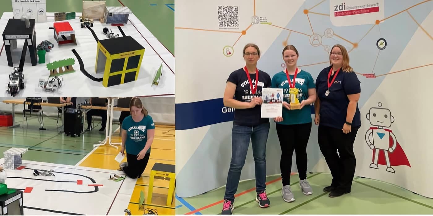 Auch die Konkurrenz hatte zwei starke Durchgänge, so dass man sich nicht sicher sein konnte, ob es wirklich für den Sieg reicht. Die Wartezeit bis zur Siegerehrung war lang, und wir waren alle froh, als endlich das Ergebnis verkündet wurde. Wir waren gespannt und konnten er kaum glauben, als feststand, dass wir gewonnen haben. Das ist somit der NRW-Landessieg und alles was wir hätten erreichen können. Nun geht eine schöne, aber auch anstrengende Zeit zu Ende, da hinter diesem Wettbewerb rund ein halbes Jahr Vorbereitungszeit steckt. Wir sind als Team sehr dankbar, für alles was wir erlebt haben und freuen uns sehr über den Sieg! | Naja Noreiks für das Team GREMbots