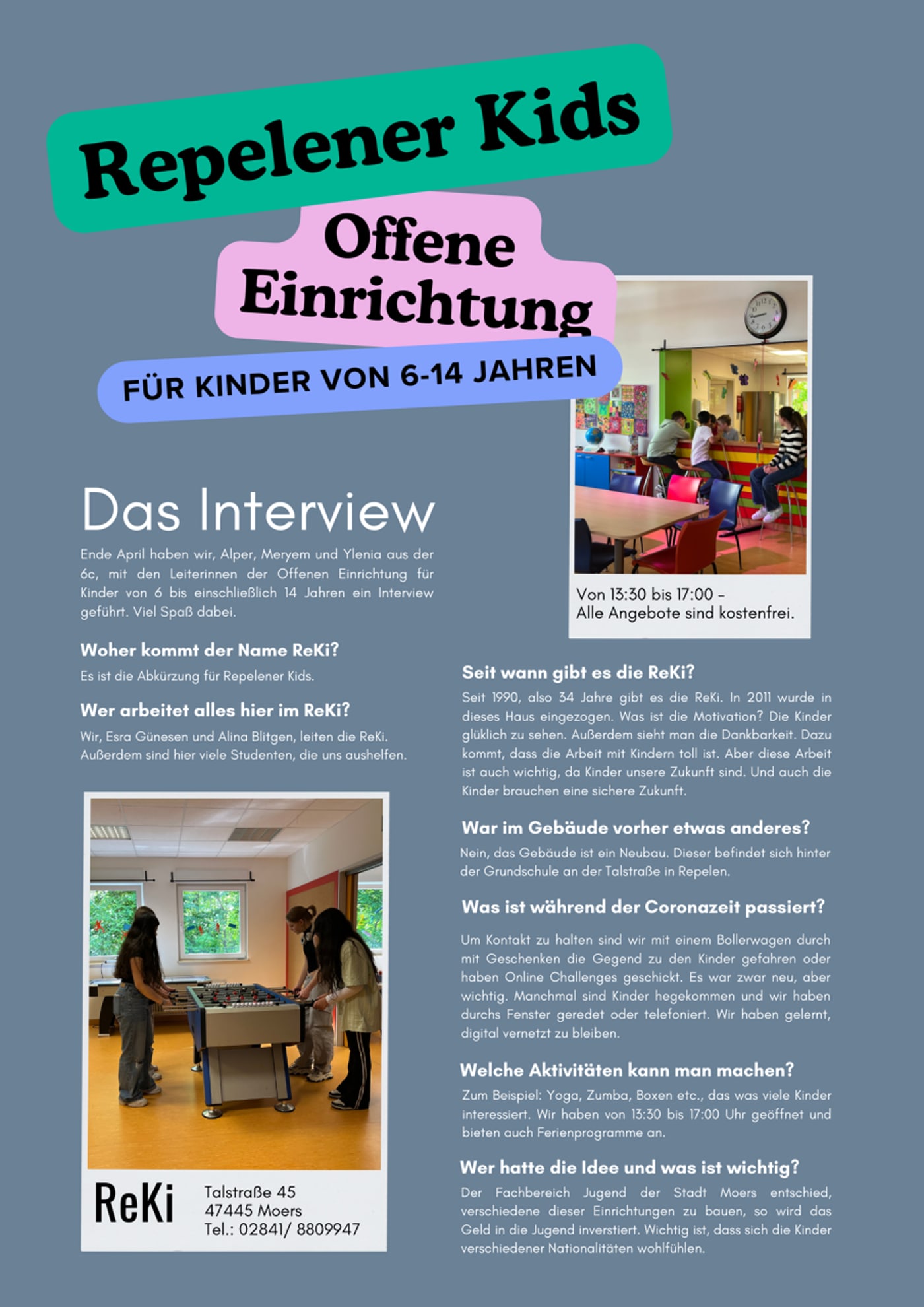 Die Klasse 6c hat im April die Offene Einrichtung ReKi besucht und in einem Interview alle wichtigen Informationen für Euch zusammengestellt.