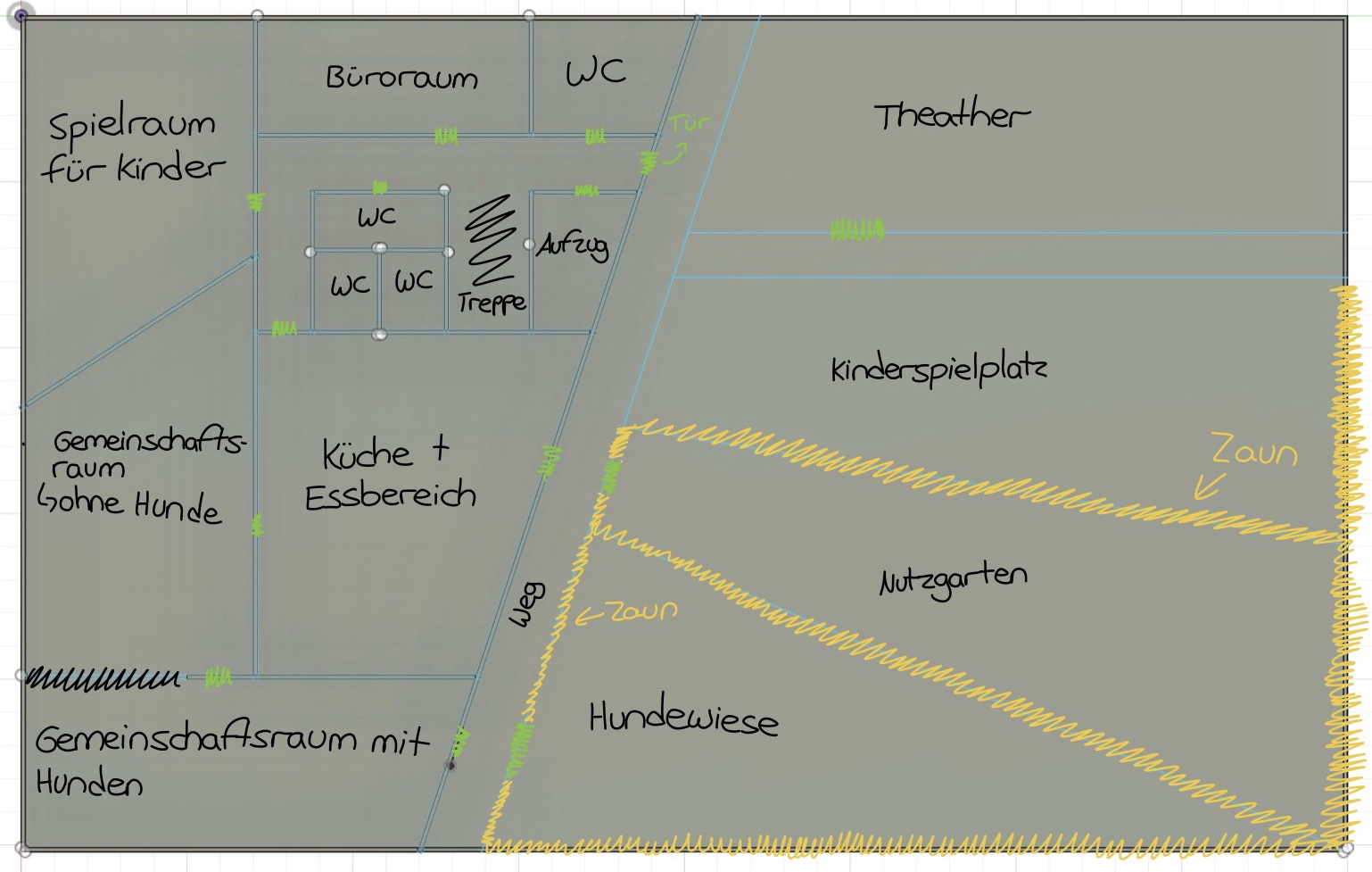 Nachdem wir den ersten Spieltag erfolgreich beendet hatten, ging es zügig an die Aufgaben des zweiten Spieltages. Unser größter Feind: die Zeit! In genau vier Wochen musste ein gesamtes Modell geplant, entworfen und zusammengesetzt werden. Neben der Klausurphase im Abiturjahr eine echte Herausforderung, die gedanklich aber auch für eine willkommene Abwechslung neben dem Schlussstoff sorgte. Auch wenn in dieser Runde nur drei der im letzten Beitrag erwähnten Personas miteingebracht werden mussten, war es wichtig, für die Planung des gesamten Modells auch die Personas der kommenden Runden zu berücksichtigen. Zusammengefasst musste das Modell in dieser Runde behindertengerecht, hunde- und kinderfreundlich sein. Wichtig wurde in dieser Runde das sogenannte CAD-Zeichnen (Computer-Aided Design). Es beschreibt das Erstellen technischer Zeichnungen und Modelle mithilfe spezieller Software, die präzises und effizientes Entwerfen in 2D und 3D ermöglicht. Auf dem ersten Bild erkennt man zunächst die groben Umrisse des Bürgerzentrums (mit eigenen Notizen), während das zweite Foto das fertige 3D-Modell zeigt.