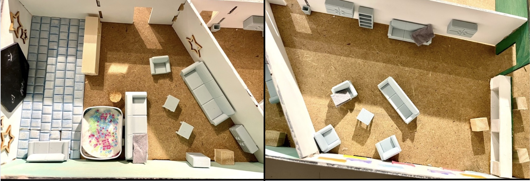 Zusätzlich habe ich zwei Konzepte in meinem Modell und der Planung berücksichtigt: die 17 Ziele der UN und das Prinzip der Donut-Economy. Schließlich durfte der Nachhaltigkeitsaspekt nicht zu kurz kommen. Beide Ansätze haben unterschiedliche Schwerpunkte, sind aber durch die Förderung einer nachhaltigen, gerechten und zukunftsorientierten Entwicklung eng miteinander verbunden. Aufzulisten, wo welche Aspekte zu finden sind, würde jetzt jedoch den Rahmen sprengen. Zwischendurch sind wir über verschiedene Herausforderungen gestolpert, wie z. B. dass die Farbe, mit der ich mein Modell anmalen wollte, zunächst nicht haftete. Auf dem Weg zum Ziel wurden wir aber auch von den üblichen technischen Fehlern nicht verschont. So schnitt der Lasercutter nicht tief genug durch das Holz, und die Software für den Videoschnitt machte zwischenzeitlich Probleme. Alles ließ sich jedoch mit ein wenig Geduld gut meistern. In der Zwischenzeit sind drei Teams abgesprungen, sodass „nur noch“ 19 verbleibende Teams übrig blieben. Zu guter Letzt ging es an den Feinschliff: Möbel aus dem 3D-Drucker wurden angefertigt, dekorative Elemente gebastelt und alles fotografiert sowie dokumentiert, um es fristgerecht einzureichen. Das Filament, das ich für den 3D-Drucker nutzte, bestand aus recyceltem PLA. Ganz schön viel passiert in so kurzer Zeit! Abgabe war am 18. Dezember 2024, und die Ergebnisse dieser Runde folgen Anfang bis Mitte Januar 2025. Auf den unteren Fotos sind noch ein paar Ausschnitte meines Modells zu sehen.