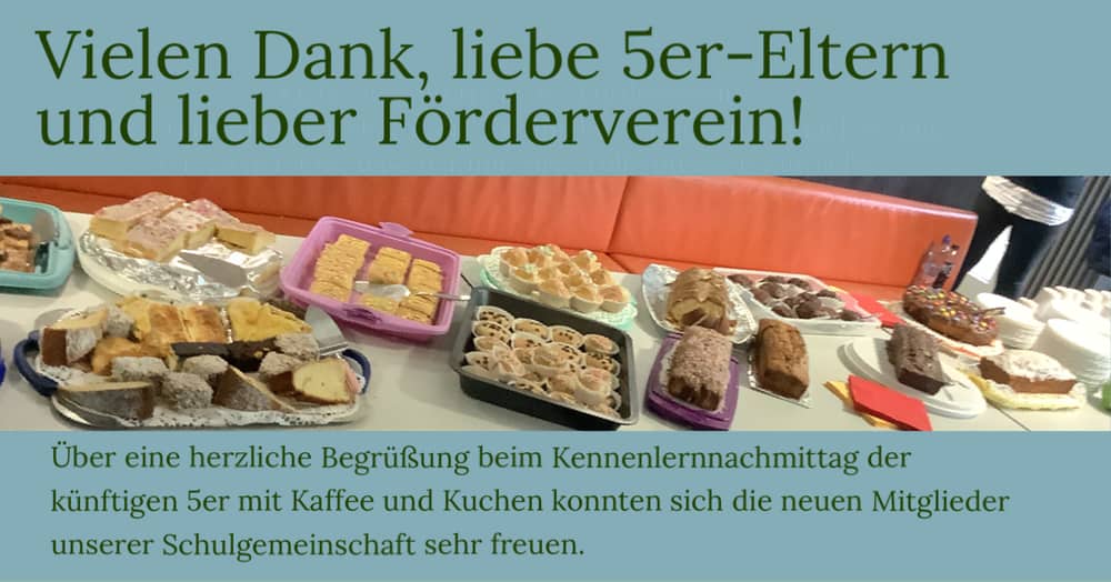 Über eine herzliche Begrüßung beim Kennenlernnachmittag der künftigen 5er mit Kaffee und Kuchen konnten sich die neuen Mitglieder unserer Schulgemeinschaft sehr freuen.