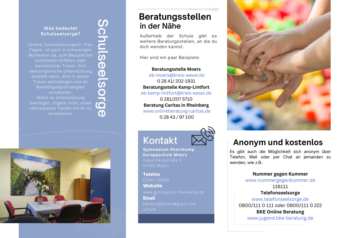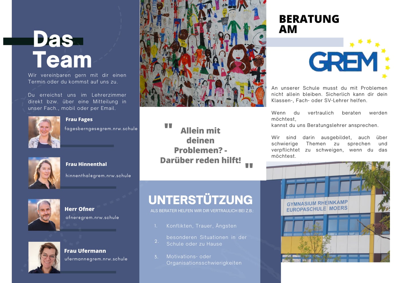 An unserer Schule musst du mit Problemen nicht allein bleiben. Sicherlich kann dir dein Klassen-, Fach- oder SV-Lehrer helfen. Wenn du vertraulich beraten werden möchtest, kannst du uns Beratungslehrer ansprechen. Wir sind darin ausgebildet, auch über schwierige Themen zu sprechen und verpflichtet zu schweigen, wenn du das möchtest.